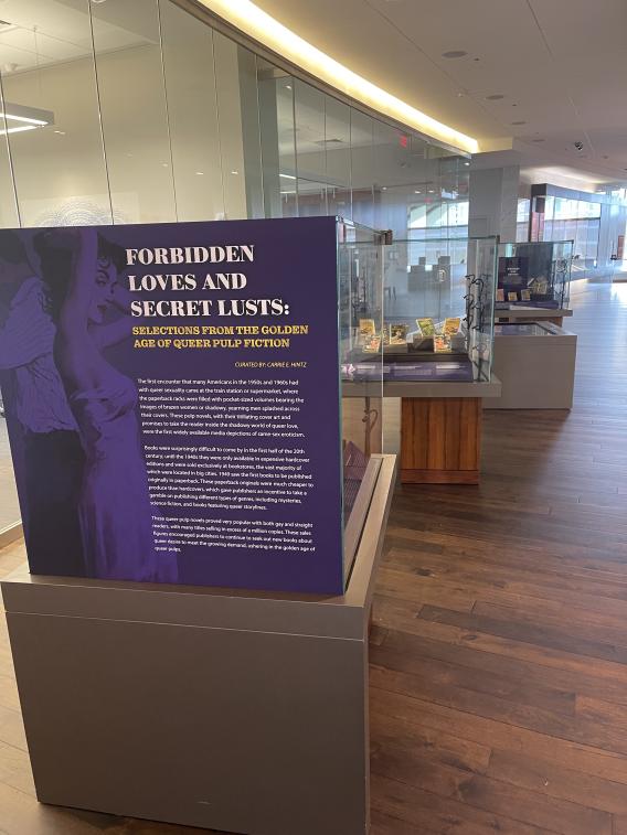 Forbidden Loves and Secret Lusts: Selections from the Golden Age of Queer Pulp Fiction is an exhibition that highlights both gay and lesbian queer pulp novels. The first encounter that many Americans in the 1950s and 1960s had with queer sexuality came at the train station or supermarket, where the paperback racks were filled with pocket-sized volumes bearing the images of brazen women or shadowy, yearning men splashed across their covers. These pulp novels, with their titillating cover art and promises to take the reader inside the shadowy world of queer love, were the first widely available media depictions of same-sex eroticism.