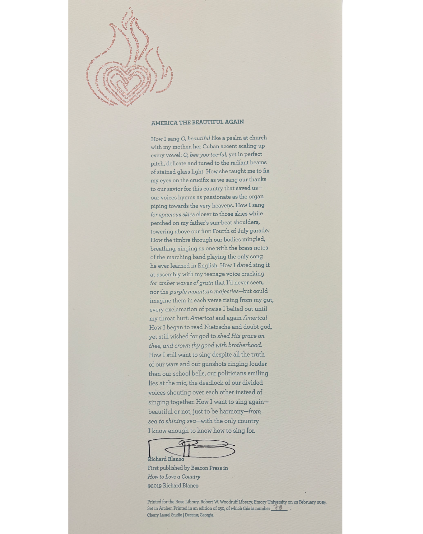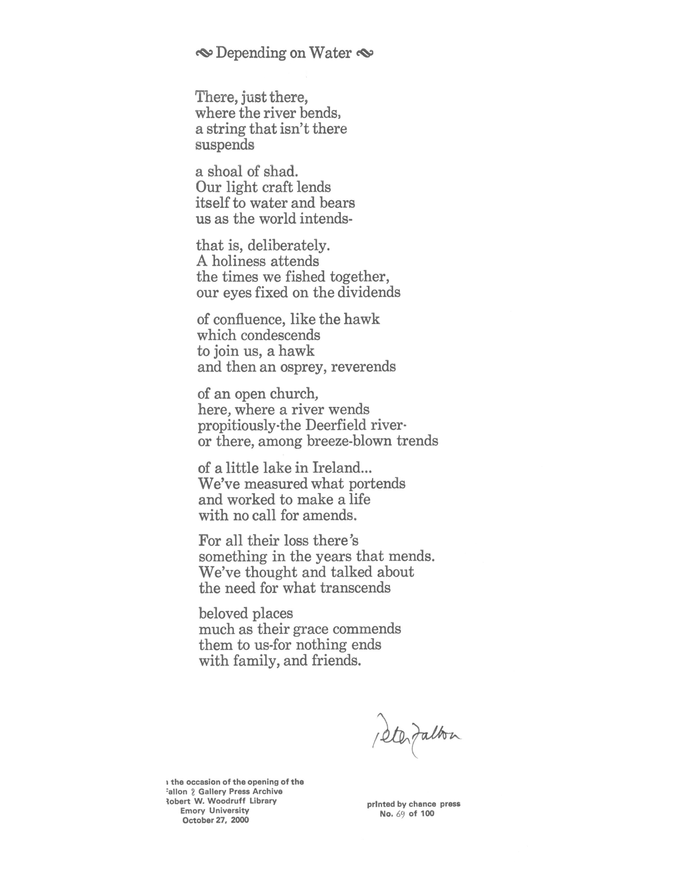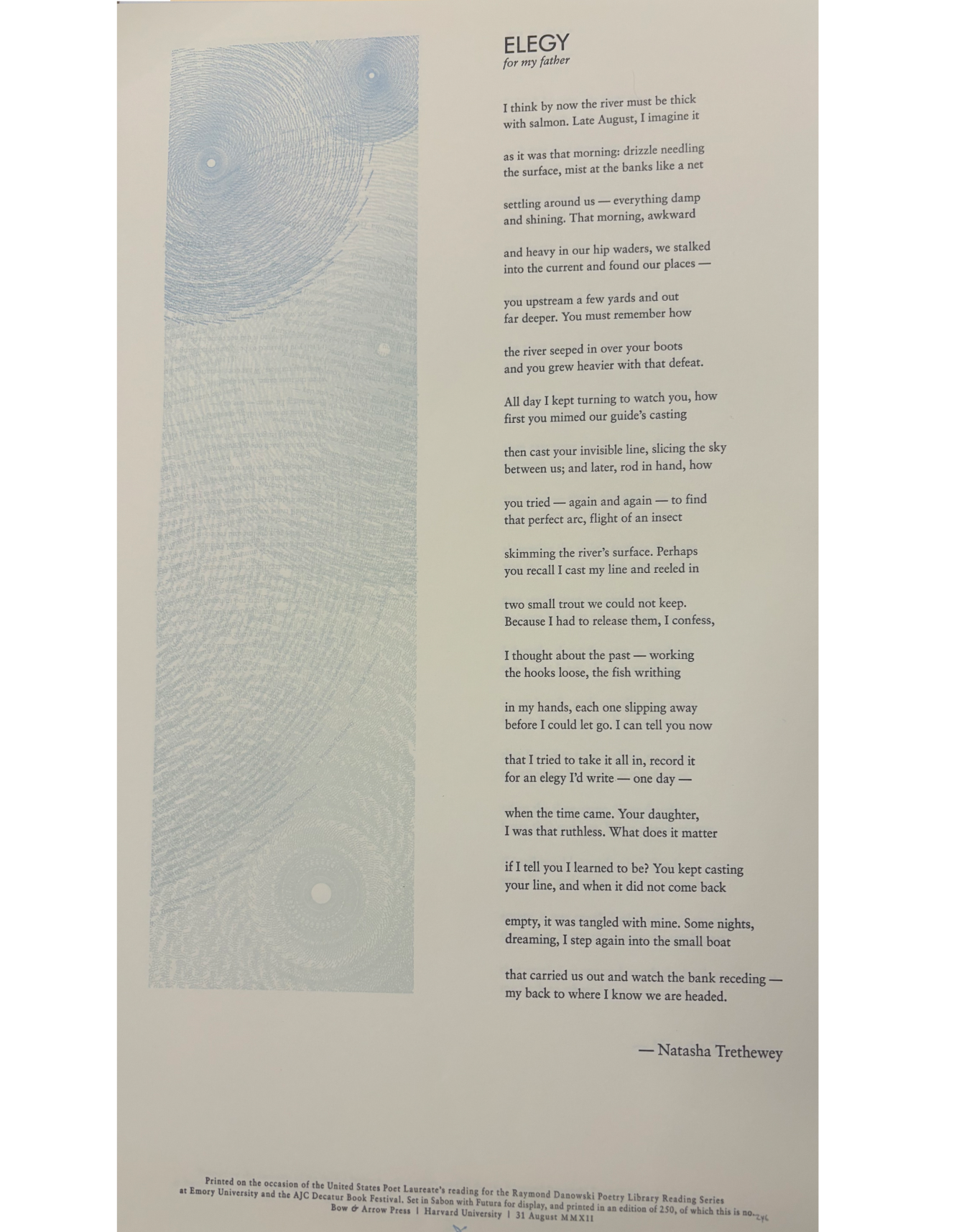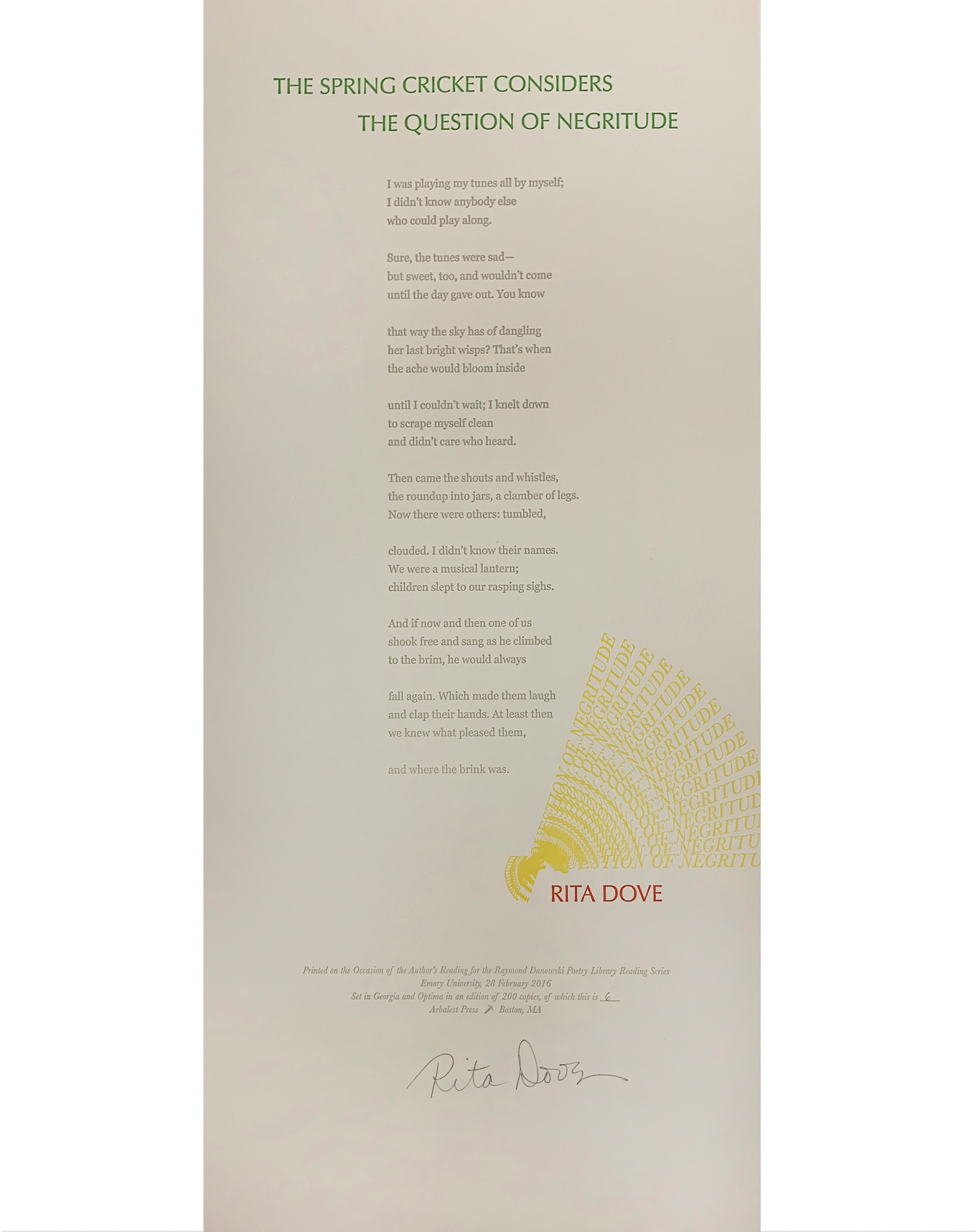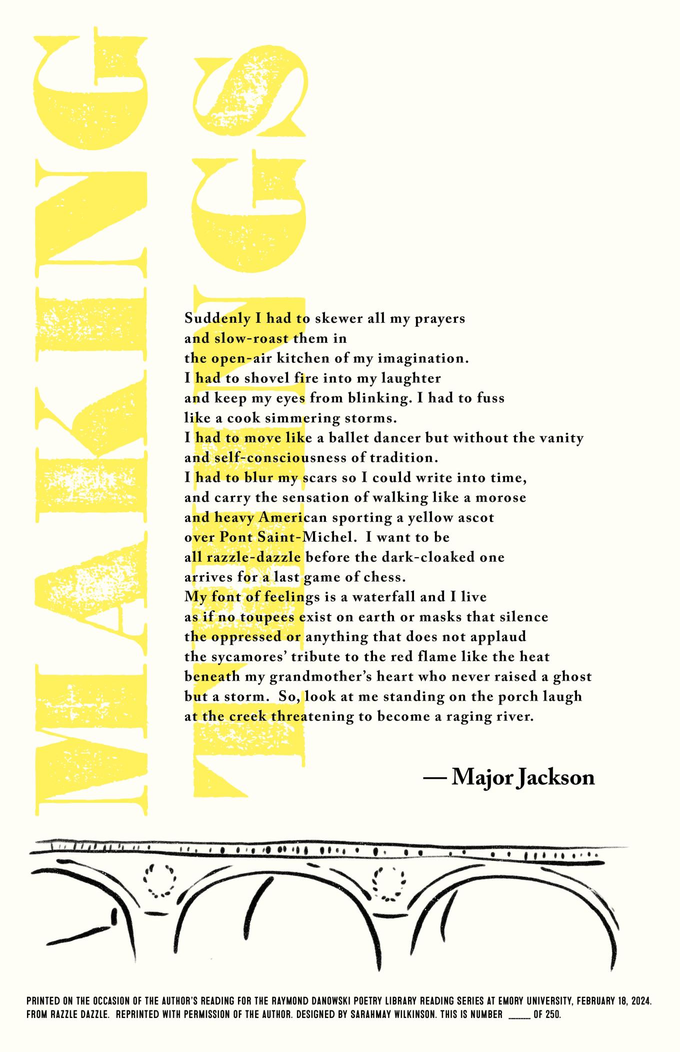 The Rose Library commemorates our Raymond Danowski Poetry Library Reading Series and other major events with broadsides designed and produced in limited editions. Broadsides are for sale for $50 each on a first come, first serve basis. Sales support the Rose Library's poetry collections and programming. To purchase a broadside please reach out to Erin Glogowski, Operations Program Coordinator, at eglogow@emory.edu.
